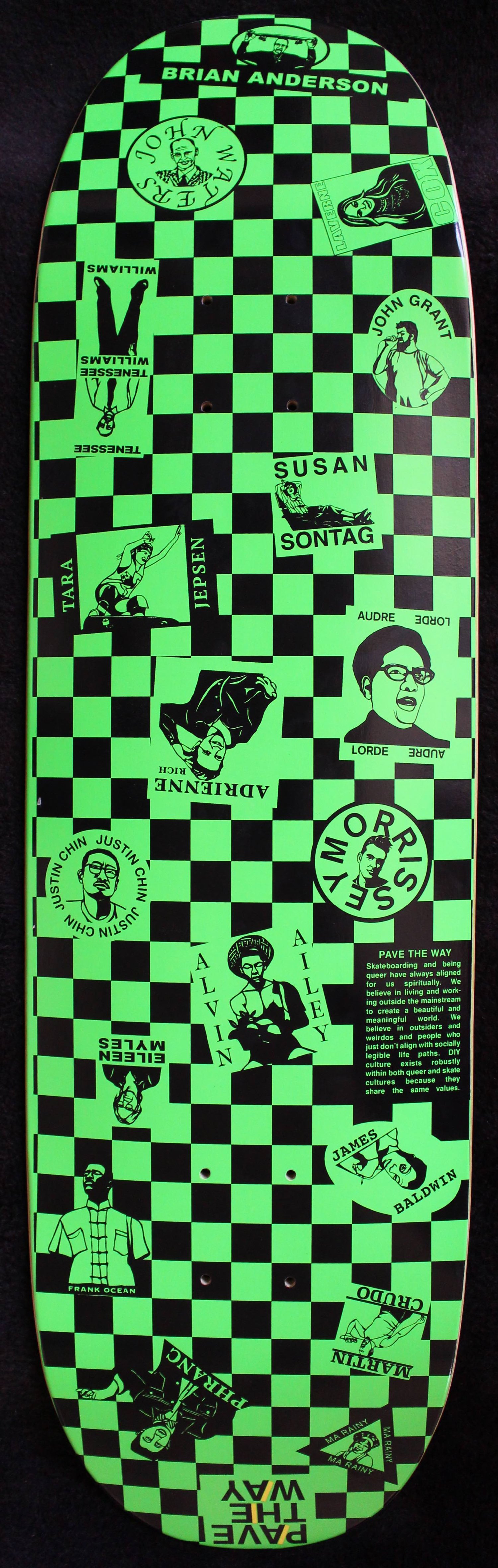 Our standard popsicle/tongue depressor shape, for the street skaters and children in your life (often the same thing, a two-fer). Skate whatever the hell you want with it! 8.5" wide, 32" long. Wheel base is 14.5". Ready to party when you are (you provide the lentils and kombucha baby). Graphic depicting queer icons past and present (except Tara, who needs to put away her gladhand, sit down and watch for once). BA and Audre Lorde, together at last!!